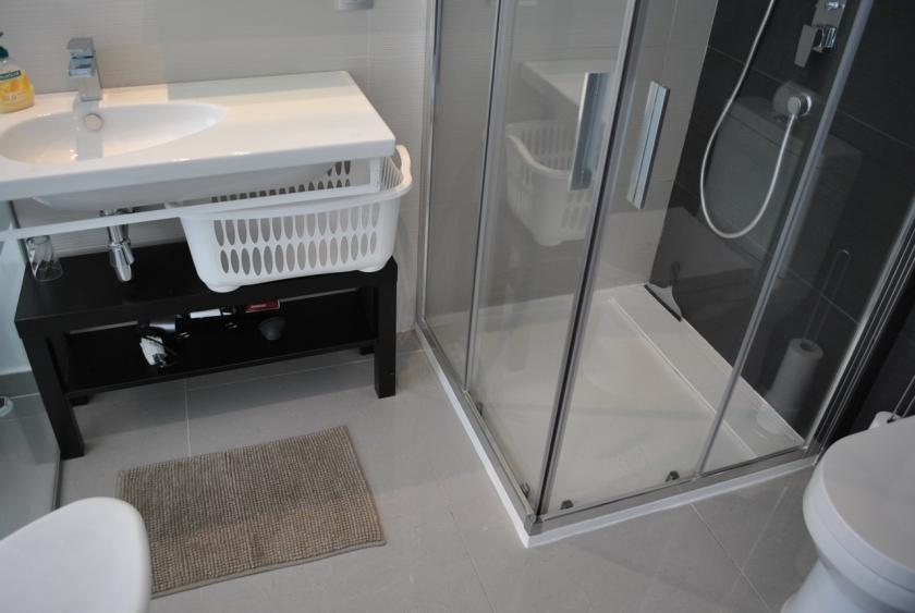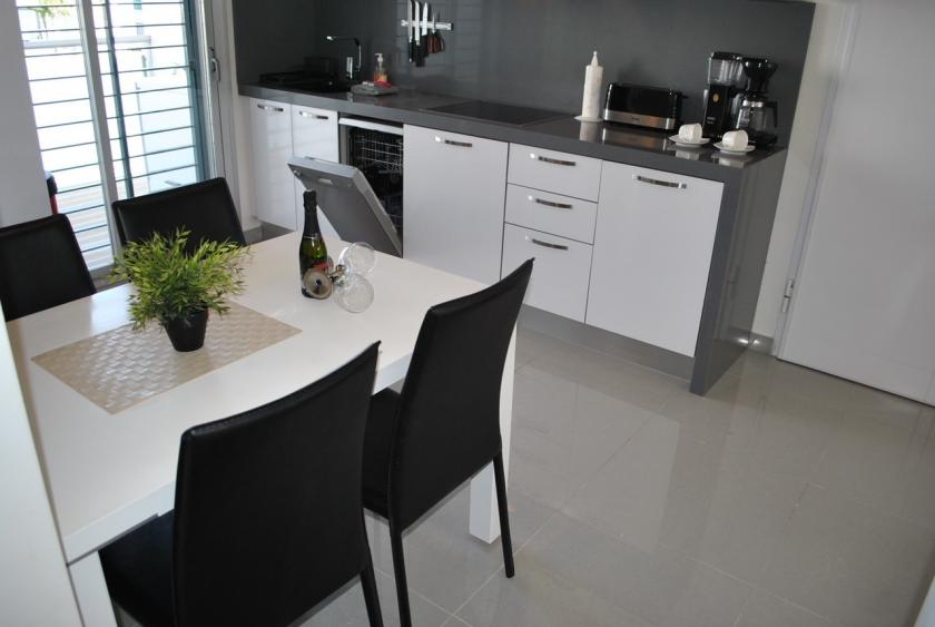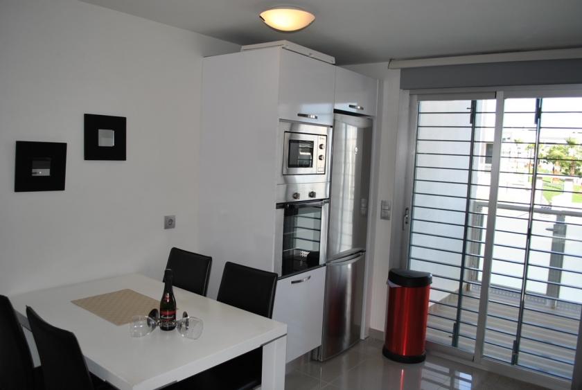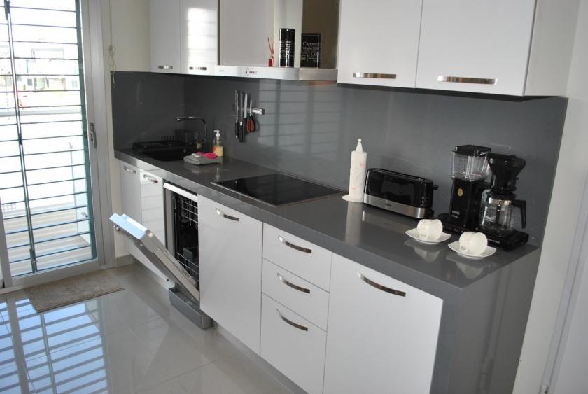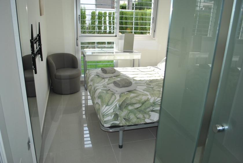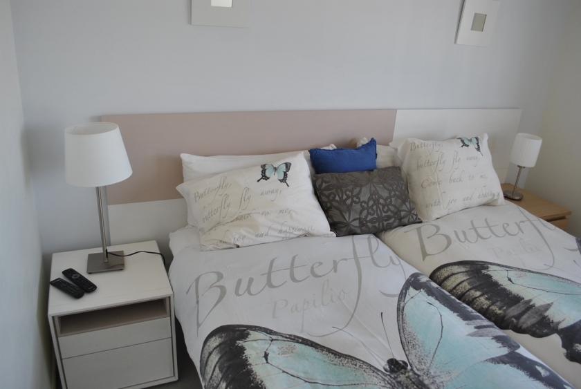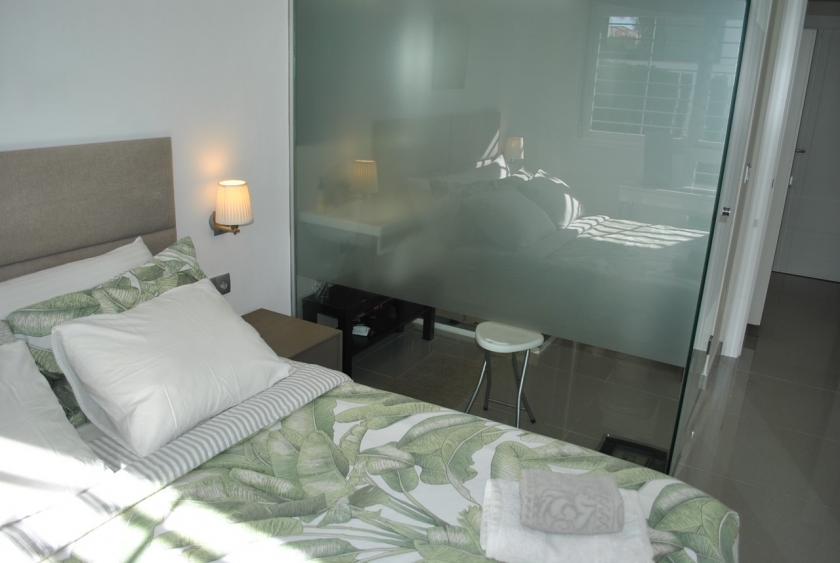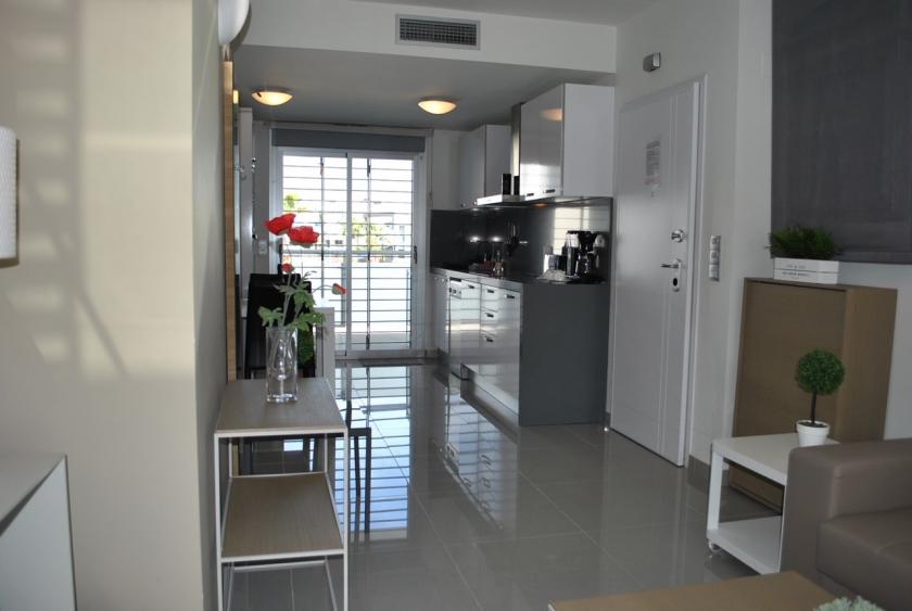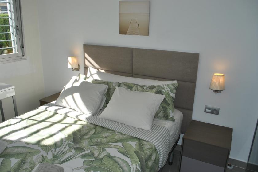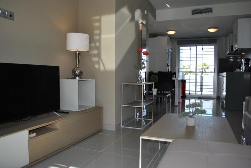 Ferielejligheden har en rummelig og elegant indrettet stue med en smart TV med internationale kanaler og WiFi. Det fuldt udstyrede åbne køkken har alle nødvendige apparater, herunder opvaskemaskine. Der er to badeværelser, hvoraf det ene er en-suite med bruser, og to soveværelser: et med dobbeltseng og det andet med to enkeltsenge, begge med indbyggede skabe. Lejligheden har også aircondition (varm og kold).