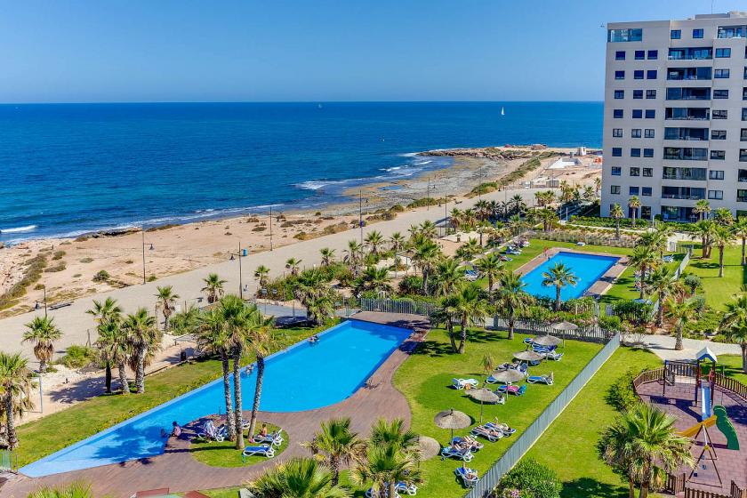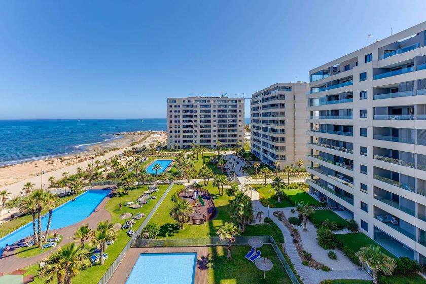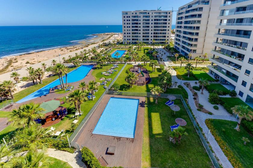 La zone commune comprend 3 piscines à débordement, un jacuzzi d'eau chaude, une pataugeoire pour enfants et une aire de jeux pour eux également. Panorama Mar, est une communauté fermée privée avec surveillance en circuit fermé. Il y a un parking souterrain et une salle de stockage. Le complexe dispose d'un accès direct à la promenade de Punta Prima.